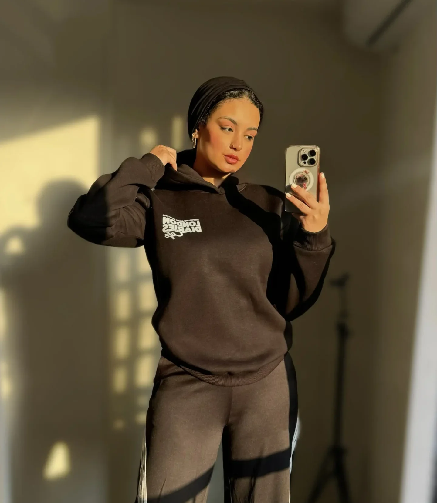 الخامة ميلتون قطن 100% ناعمة على البشرة ومناسبة للأجواء الباردة. الموديل في الصورة لابسة مقاس لارج، وده بيأكد قد إيه بيكون مريح ومناسب للحركة اليومية. متوفر بألوان مميزة: كحلي، رمادي، أسود، وأبيض، علشان تختاري اللي يناسبك. 💕